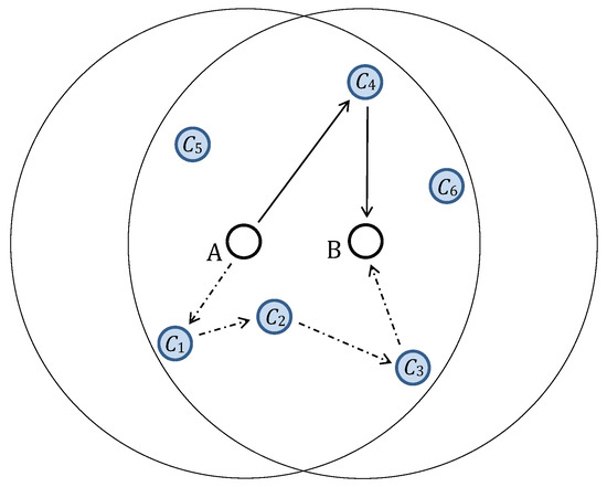 Two paths selected for a key update transmission from node A to node B. The solid lines mark a delivery path with a single selected intermediate node, , and the dash-dotted lines mark a delivery path with three intermediate nodes, , , and . The link keys used to encrypt the message are and in the first case and , , , and in the second case (image from [7] © 2019 IEEE).
