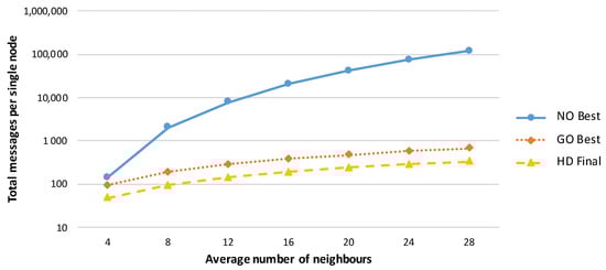 Total numbers of messages required per node in the best node-oriented, best group-oriented, and final hybrid designed secrecy amplification protocols (under the assumption of a network with 7.5 neighbours per node on average). The group-oriented and hybrid designed protocols send considerably fewer messages compared with the node-oriented protocol.