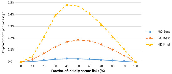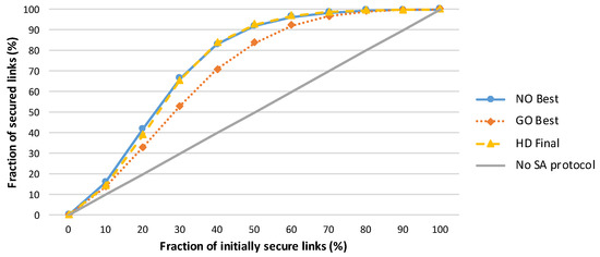 The increase in the number of secured links is initially rapid, as the protocol can immediately use the newly secured links to its advantage. As the network approaches the state in which most links are secured, the increase slows, as not all secured paths are used (the HD Final protocol identifies only two intermediate nodes) and it may be more difficult to secure particular links (e.g., because of a lack of common neighbours for a neighbouring pair on the border of the network).