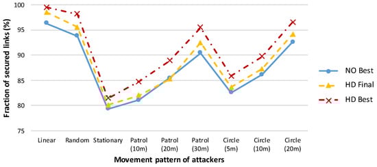The experimental results for an attacker starting outside the network in the corridor are shown in Figure 8. The success rates of the HD Final protocol are greatly improved as a result of the disadvantageous position of the attacker. The success rate is greater than 85% even for the case in which 100% of the link keys are initially compromised, provided that the attacker does not remain stationary.