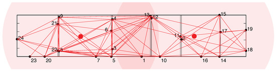Our network layout, consisting of 24 legitimate nodes, indicated by black points and their corresponding indexes. The nodes are placed below the ceiling in six adjacent rooms. The initial positions of the attackers are marked with red points. These positions enable the attackers to monitor all legitimate communications between every pair of neighbours.