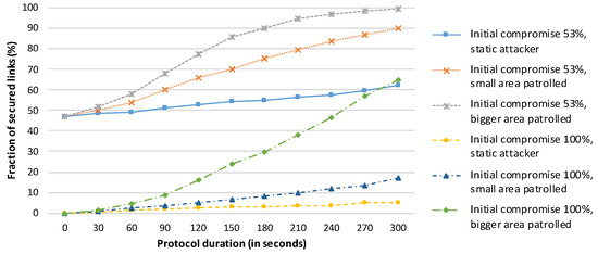 We also wanted to investigate protocol performance and to determine a suitable duration (together with a suitable number of protocol repetitions) of the HD Final protocol to achieve reasonable network security (more than 85% secured links) in the worst-case scenario. The worst-case scenario corresponds to the initial compromise of all link keys and the most favourable attacker strategy, in which she starts at a position from which she can monitor the entire network and remains stationary.
