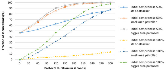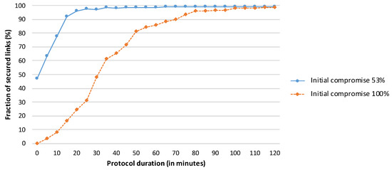 The objective of this experiment was to identify the number of repetitions of the HD Final protocol (and the protocol duration) required to achieve reasonable network security (more than 85% secured links) for the scenario in which all links are initially compromised. We repeated the complete HD Final protocol 24 times, with the resulting execution time of 2 h. We also include an evaluation of the protocol performance for the case where 53% of the links (instead of all links) are initially compromised as a reference for comparison. The results are presented in Figure 9.