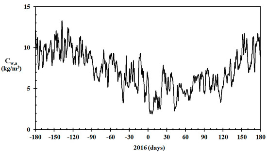 In the Western Norway coastal areas, the ambient water vapor concentration varies considerably during the year. Ambient temperature and relative humidity for Norwegian meteorological stations may be retrieved for free from www.eklima.no. The ambient water vapor concentration based on data recorded at the Haugesund Airport meteorological station (N 59.3448, E 5.2107), that is, = RH·, from 1 July to 30 July 2015, is shown in Figure 1. It is seen that the water vapor concentration was especially low during periods in the winter.