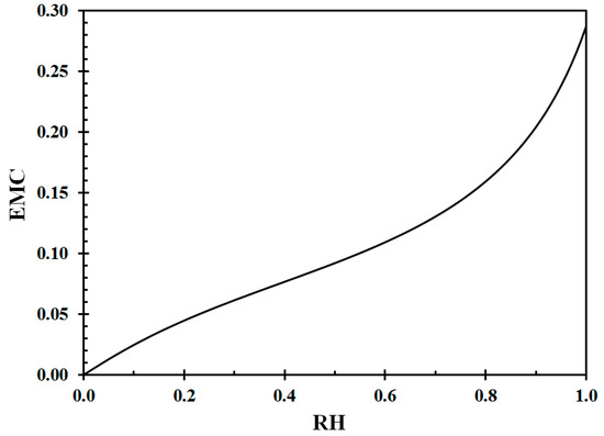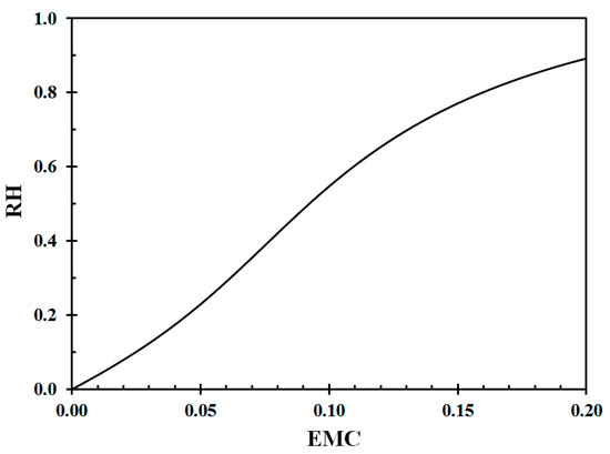Relative humidity (RH) as a function of equilibrium moisture content (EMC) at 22 °C. Data from Equation (6) [20].