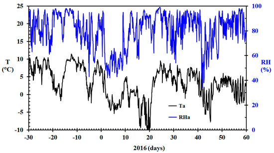 Ambient temperature (T) and relative humidity (RH) for Haugesund Airport in the period December 2015 through February 2016. (Data from www.eklima.no).