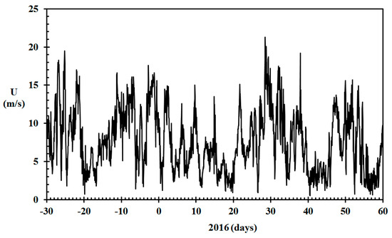 Wind speed, U (m/s), for Haugesund Airport in the period December 2015 through February 2016. (Data from www.eklima.no).