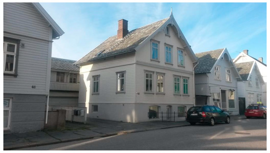 It was decided to test the model for a wooden home built in 1910 in Haugesund town center, Norway (N 59.4083, E 5.2750). The home, as shown in Figure 6, is a timber frame construction typical for that time period [40]. The internal walls in contact with the indoor air consist of 10–12 mm wood linings (pine or fir) on a vapor air barrier. Then, there is a layer of thermal insulation which in homes of this age were solid wood, 2–3″ thick. Following this, there is a wind barrier, a ventilated space and finally, the external rain protective wood cladding. The home studied has an indoor wood surface contact area of 100 m2.
