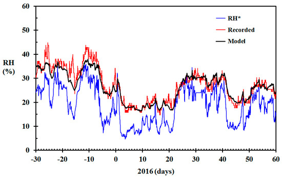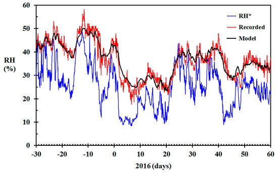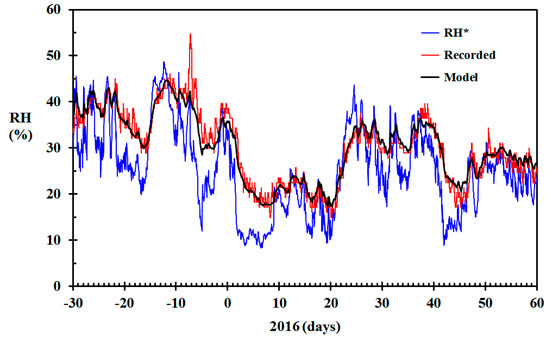 Modeled relative humidity (RH) (black) based on the data from Figure 4 and air change rate based on Equation (16) (γ = 300 h−1), RH recorded in the living room (red) and RH* based on infinite air change rate (blue) December 2015 through February 2016 for the home built in 1910.
