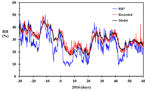 It was decided to test the model for predicting the indoor relative humidity of a wooden home built in 1917 and located in Haugesund, Norway, at N 59.4166 and E 5.2686, based on the meteorological observations presented in Figure 3. This home was quite similar to the home built seven years earlier, with a footprint of about 80 m2 and an indoor wood surface contact area of approximately 100 m2. The air change rate adjusted for stack effect, as suggested in Equation (17), with = 300 h−1, was therefore used for the modeling. The results are shown in Figure 9, including the recorded indoor RH values. The RMS error of the modeled RH versus the recorded RH was 2.2% RH.