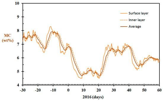 Wall panel moisture content (MC) for the home built in 1917, December 2015 through February 2016, modeled based on the data from Figure 4 and γ = 300 h−1.