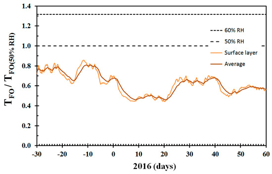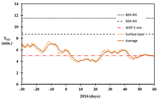 Estimated time to flashover (Equation (18)) for ¼ scale wooden compartments when in equilibrium at 60% relative humidity (RH), 50% RH and the moisture content calculated for the surface layer and the average wood panel moisture content in the period December 2015 through February 2016. (Wood moisture data from Figure 12.) The red dashed line represents 5 min to water on fire (WOF).