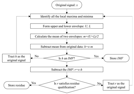 EMD is a fully data-driven algorithm. EMD can adaptively decompose any signal into several IMFs and a residual [19]. The IMFs and the residual are obtained through a screening process, the detailed steps for which are shown in Figure 1.