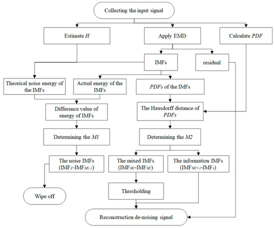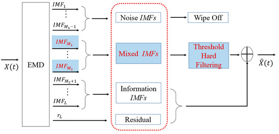 Traditional denoising methods based on empirical mode decomposition (EMD) are mainly classified into two categories: the partial reconstruction of relevant modes and the whole reconstruction of all filtered modes [26,27]. However, when the signal-to-noise ratio (SNR) of the signal is high, the useful signal is also decomposed into lower-order intrinsic mode functions (IMFs), in which case the useful information may be mistaken for the discarded irrelevant information. To avoid losing useful information, the irrelevant IMFs should be defined as accurately as possible. To this end, we proposed a novel method to denoise the noisy signal; our focus was on discriminating the IMF type (pure noise IMF, mixed IMF, or information IMF). Then, the IMFs in different categories were processed separately.