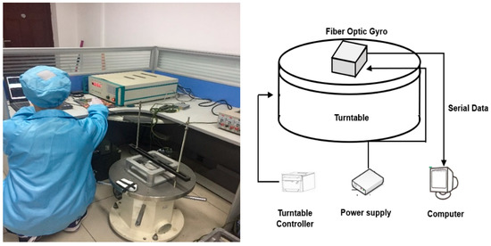 The experiments were performed on both static and dynamic test signal, which were collected in a laboratory with a room temperature of 25 °C. The fiber optic gyroscopes (FOG), the construction of the turntable test, and the data transmission equipment are shown in Figure 4. The turntable was made by China National Shipbuilding Corporation; its rotational angular velocity is 0.0001°. The FOG was made by Beijing Aerospace Times Optical-Electronics Technology Co., and is a test product with a zero offset of 0.3 °/h and a sample period of 0.39 ms. The static data collected from the gyroscope remained stationary for more than one hour, and each rotational dynamic datum was collected from the turntable after more than ten minutes. The dynamic test was set to five different uniform rotation speeds: 10 °/s, 20 °/s, 30 °/s, 40 °/s, and 50 °/s, respectively. The FOG and the turntable were restarted for each different test.