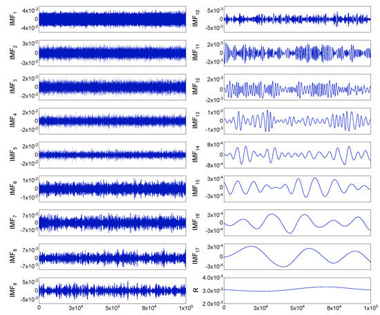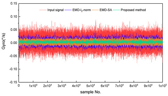For the real static data, we used a fiber optic gyroscope (FOG) sensor with a zero offset of 0.3 °/h. The sample period was 0.39 ms, and the total number of data samples was N = 9262,589. To avoid the influence of human operations of the instrument during the startup and shutdown phases, 100,000 data points in the middle part of the samples were chosen. Using these 100,000 data points and Equation (8), the Hurst exponent was estimated as a value of 0.5167. The data were decomposed into 17 IMFs and one residual by EMD processing, and are shown in Figure 5. After determining the pure noise IMFs, the mixed IMFs, and the information IMFs, by thresholding the mixed IMFs and reconstructing the optimal signal, we obtained the denoising results. Figure 6 shows the static test signal and the denoised signals using the three denoising methods. The proposed method (Scheme 4) offers the best denoising effect, with which the noise is significantly reduced.