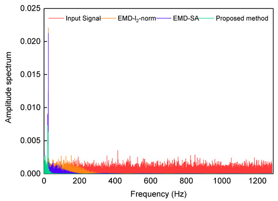 Amplitude spectrum of the signal. The red line is the gyroscope signal; the blue, orange, and green lines are the denoising results of EMD--norm, EMD-SA, and the proposed method, respectively.