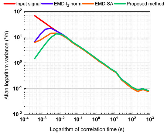 Allan variance is recommended by the Institute of Electrical and Electronics Engineers (IEEE) to analyze random gyroscope error. Thus, we adopted Allan variance to further compare the effects of the three denoising methods. The results are shown in Figure 8. The three de-nosing methods can reduce the noise, and the proposed method offers the best performance.