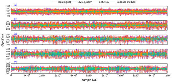 The gyroscope dynamic signal and its denoised results for three denoising methods in the five dynamic tests. The red line is the gyroscope’s dynamic signal; the blue, orange, and green lines are the denoising results of the EMD-l2-norm, EMD-SA, and the proposed method, respectively. (a–e) Dynamic gyroscope signals and the denoised results for the three denoising methods, with speeds of 10 °/s, 20 °/s, 30 °/s, 40 °/s, and 50 °/s, respectively.