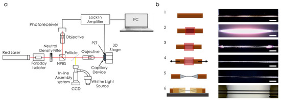 (a) Schematics of the experimental setup. (b) Thermal stretching process. Step 1: original capillary. Step 2: initial heating. Step 3: polyimide removal. Step 4: axial pulling. Step 5: final capillary. Step 6: Photolithography of the supporting pads. The optical micrographs show the whole process, the white scale bars are 1 mm, whereas the black scale bar is 100 µm.