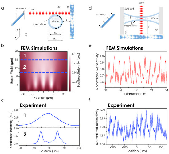 The use of super long working distance microscope objectives allows for the confinement of the electromagnetic field in volumes smaller than the actual size of the capillary wall thickness. Therefore, harnessing the low refractive index contrast, it is possible to couple light inside the fused silica walls. This light evanescently interacts with the standing wave generated by the interference of the reflected power coming out from the silicon substrate underneath the incident light. Thus, the evanescence interaction between the light trapped in the fused silica and the surrounding electromagnetic field depends on the capillary-substrate distance. The thermal stretching process described in the fabrication procedure predefines this distance. Please note that the distance with the substrate depends on the initial/final outer diameter ratio, which varies along the axial direction due to the thermal process. This fabrication aspect opens the door for a double-side optical cavity probing. We have mounted the capillary on a 3D piezo-controlled positioner; therefore, we can scan the laser spot across the sample. Depending on the scanning direction, it is possible to probe both the wall thickness optical cavity at one fixed capillary–substrate distance, or the interference pattern generated by the light bouncing inside the length-varying optical cavity sustained by the capillary and the silicon substrate underneath (Figure 2). Figure 2a shows a schematic depiction of the transversal scanning (along the y-axis according to the designed coordinates). With this configuration, we are going to probe the fused silica trapping while keeping the distance to the substrate and the diameter constant. In order to demonstrate the optical cavity, we are going to change the laser beam waist (red laser, wavelength ) from 1 µm up to the size of the capillary for each 70 µm y-sweep. First of all, we are going to perform a simulated study by using the Finite Element Method (FEM, Comsol Multiphysics). In Figure 2b, we observe the transition from a laser waist comparable to the capillary diameter up to a focused laser spot of 1 µm. We have calculated the integral of the norm of the electric field at the far field over a solid angle of 30 degrees to mimic the experimental conditions. This is equivalent to simulating the measured scattered light as a function of the y-position along the cross section of the capillary, as shown in Figure 2a. When the size of the laser spot is comparable to the capillary diameter, the scattered light shows a gaussian profile (dashed line labeled as 1 in Figure 2b). However, as the size of the illuminating spot decreases, the smaller features corresponding to the different interlayer boundaries come out, revealing different maxima at a beam waist of 10 µm (dashed line labeled as 2). This behavior is experimentally demonstrated in Figure 2c.