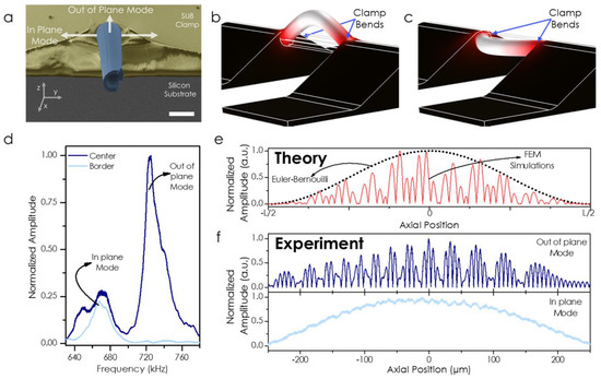 Figure 3a shows a scanning electron microscope image of the cross section of the capillary, the scale bar is 50 µm. As can be seen from the image, the SU8 pads are not homogeneous blocks, the photolithographic procedure leaves a 20 µm homogeneous thick polymer layer far from the capillary (as expected in a flat substrate) but this thickness is continuously increased in the y direction, reaching its maximal value at the position of the capillary axis. This inhomogeneous clamping defines two directions for the mechanical modes: in-plane modes (softer clamping) and out-of-plane modes (harder clamping), marked as white arrows in Figure 3a. Both modes are simulated in Figure 3b,c, showing different resonance frequencies due to the difference in the effective spring constant of both directions. It is possible to experimentally demonstrate the existence of both modes by optically measuring the mechanical spectrum at the middle point of the capillary (dark blue line in Figure 3d). However, if the measurement is performed at one side of the capillary (by simply displacing the laser spot 19 µm from the middle point in the y direction), we are only sensitive to the in-plane mode (light blue curve in Figure 3d). Please note, in principle, the system is only sensitive to out-of-plane displacements; therefore, the sensitivity of the in-plane mode mainly comes from the misalignment respect to the substrate, but we cannot neglect the fact that the reflection on a moving cylindrical surface also gives a modulation in the reflected power. From the reflectivity simulation of Figure 2e it is possible to extract the expected mode shape as described in Equation (1). The expected mode shape, Figure 3e, ends up with a modulated amplitude in the mode profile. This expected mode shape is experimentally demonstrated in Figure 3f, where we show the interferometric measurement of the out-of-plane mode (dark blue curve) and the in-plane mode measured 19 µm away from the capillary axis in the y direction (light blue curve). At this position, the interference pattern is vanished because we are only collecting the scattered light.
