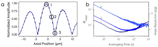 The figure of merit of our optomechanical transduction system is the frequency stability. The way to characterize the noise level of our readout system is to calculate the Allan deviation, , where is defined as the Allan variance and is calculated from the average of frequency samples measured in a temporal integration time , . The higher the signal-to-noise ratio, the lower the frequency noise measured [40]. Therefore, by using our optomechanically enhanced displacement sensitivity, we should be able to reduce the frequency noise. Figure 4a shows the mode profile of the out-of-plane mechanical mode for an axial scanning position of 25 µm. As it was described above, the mode amplitude is modulated along its axial coordinate due to the continuous variation of the diameter. By simply displacing the laser spot by 2.5 µm from the center position, the maximum oscillation amplitude of the out-of-plane mode becomes a minimum. This difference is also observed in the Allan deviation measurement (Figure 4b). It is possible to decrease the frequency noise by one order of magnitude from the measurement point labeled as 1 in Figure 4a to the measurement point labeled as 3. The Allan deviation reaches a value of for an integration time of 100 ms at measurement point 1, one order of magnitude lower than previous works with non-coherent optical transduction method [35,36]. This Allan deviation can be converted into mass resolution by considering that the frequency shift produced by a punctual particle (as described in Equation (3)), obtaining a mass resolution of 600 fg for an integration time of 100 ms at measurement point 1,