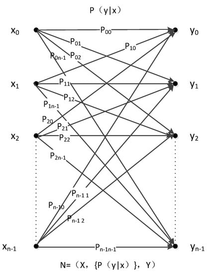 In Figure 1, input set X consists of n symbols, namely, x0, x1, x2, ……, xn−1, whereas the output set also consists of n symbols, namely, y0, y1, y2, ……, yn−1. The relation between these inputs and outputs is N = (X,{P(y | x)},Y), where Pi,j is the probability that each input xi may become output yi through this channel. Next, must be satisfied. In other words, if the input is xi, then the probability of output y0 is Pi,0 while that of output y1 is Pi,1, and so on, through this channel. It can confirm the value between P00 and Pn−1,n−1. In addition, each value of Pi,j is larger than or equal to 0 and less than or equal to 1.
