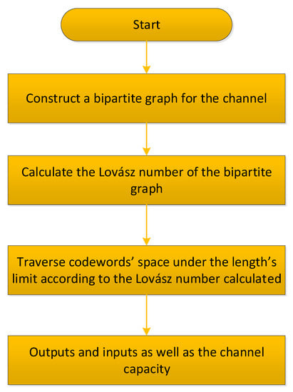 In classical communication, channel coding is achieved by combining isomorphism theory and matrix vectors. Encoding is divided into three steps. First, the channel is translated into a bipartite graph. Channels can be directly converted to bipartite graphs because probability has no effect on the computation of zero-error capacity and coding in the classical channel. Next, the Lovász function confirms the number of letters that correspond to symbols during encoding to ensure that the symbols are not confused [6]. Finally, graph isomorphism is used to determine the coding. For example, if the result of the Lovász function is calculated using , then three-letter messages during encoding indicate that n symbols are non-obfuscation. The procedure for determining the n inputs is as follows. An input is assumed to be 000. Then, the disjoint output is located in 10X (X stands for any symbol of 0 or 1). If the input that matches the condition that is not confused with 000 is not found in 10X, then the input will search for 11X. These inputs are known as two non-obfuscation inputs. In this way, qualified inputs are sought constantly until the n inputs are obtained. Obviously, one almost has to traverse whole codewords’ subspaces to search for effective codewords. It will take nearly steps to complete this process. As a result, the upper bound of the total computational complexity of this method should be due to . The complete procedure of the classical zero-error coding is described in Figure 2.