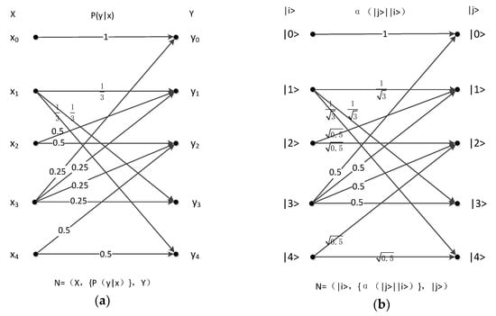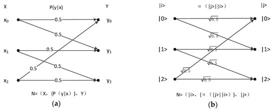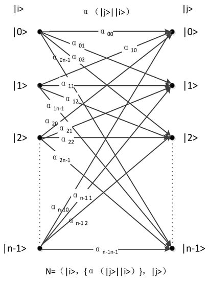 Figure 3 shows the pure states of n inputs and outputs as |0>, |1>, |2> … |n − 1>. The pure state (i is an integer and ) becomes the superposition state via the quantum channel (ground state is in the outputs; variable j is an integer and ). is the coefficient of the relation between ground states and and satisfies the condition of . Analogous to classical channels, the probability that ground state becomes ground state is .