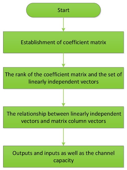 In channel matrix P, row and column coordinates are input and output, respectively (i.e., the probability of input to output is ). The corresponding coefficient matrix is also input to the column and row coordinates, and the expression is the probability coefficient of input to output . Moreover, the column vectors in the coefficient matrix can be expressed with .