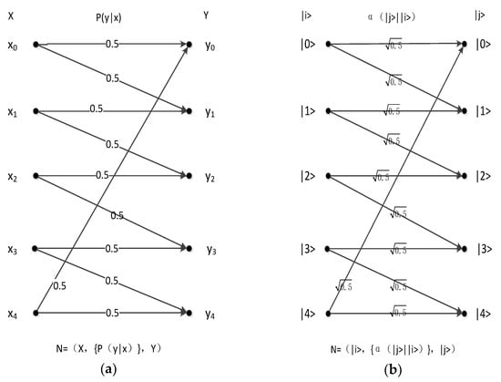 (a) Classical five-symbol multilateral obfuscation channel; (b) quantum five-symbol multilateral obfuscation channel.