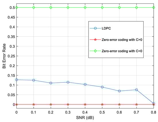 In addition, the channel capacity and bit error rate (BER) of zero-error coding and the method of low density parity check code (LDPC) are compared as follows [28,29].