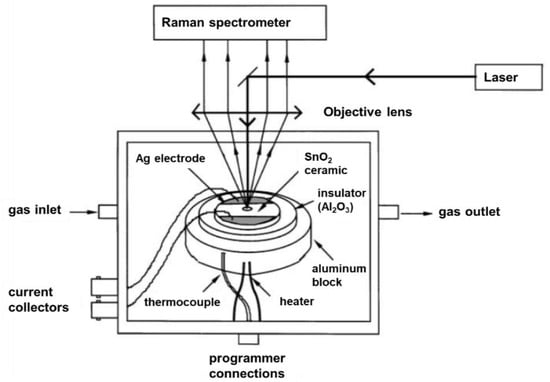 In situ (operando-pellet) setup. An early In situ Raman spectroscopic setup in the context of gas sensor applications was reported by Lucazeau and coworkers (see Figure 1) [22,24,28]. The setup allows for simultaneous Raman and impedance spectroscopic measurements at controlled temperatures of the sensor material and at defined gas feed. At the top, the stainless steel cell is equipped with a quartz window enabling visible Raman spectroscopic experiments in 180° backscattering geometry. The sample pellets are placed in an alumina crucible and contacted with different electrode materials depending on the used metal-oxide sensor material (e.g., Ag electrode on SnO2 [22], Au on WO3 [24], Pt electrode on BaCeO3 [28]). Al2O3 serves as an electrical insulator and the filled crucible is placed on a heating block. The setup enables the direct correlation between changes on the surface of the material, e.g., adsorbates, by Raman spectroscopy and the sensor resistance. However, the gas-phase composition at the outlet of the cell was not monitored.