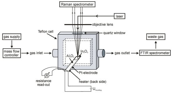 For a knowledge-based design of better gas sensors, a detailed understanding of their mode of operation on a molecular level will be required. To identify the gas sensing mechanism, operando experiments based on IR, Raman, UV/Vis, and X-ray absorption spectroscopy have been applied [5,6,7,8,9,10,11,12], to relate the sensor response to the structural changes under working conditions. To further enhance the mechanistic understanding of gas sensors, it would be highly desirable to develop operando approaches, which (i) are applicable under realistic operating conditions of the gas sensor, (ii) allow for a direct (real-time) correlation of the sensor response with the spectroscopic signals, and (iii) enable a simultaneous monitoring of the gas-phase composition [4,5,6].