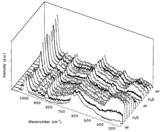 In situ Raman spectra of a SnO2 pellet during exposure to two 300 ppm H2S-air cycles at 100 °C. Bold lines indicate the first spectra recorded after atmospheric change. Reproduced with permission from [22].