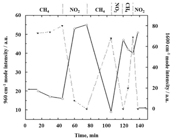 In studies on nanostructured WO3 sensors with different grain sizes exposure to 10% CH4/H2 and 1.8% CO/N2 at 150 °C resulted in the formation of carbon species and an increase in conductivity, whereas under oxidative conditions (1000 ppm NO2), the carbon species disappeared and the conductivity significantly decreased [24]. Figure 4 depicts the changes in the Raman intensity of the bands at 960 and 1600 cm−1. Boulova et al. assign the former to WO3 hydrates and the latter to carbon species. Note that second-order bands of carbon species around 2600–3300 cm−1 confirm this observation. The coverage of the surface with carbon species during CH4 exposure leads to a decrease in the intensity of the 960 cm−1 mode, thus, indicating its surface character. The sample with the smallest particle size (2 nm) exhibits the highest sensitivity to the presence of carbonaceous molecules. In contrast, Raman spectra of samples with larger particle size (>35 nm) show no changes during exposure to different gases due to the grain size effect, i.e., with increasing grain size the percentage of surface atoms decreases and the 960 cm−1 signal disappears from the Raman spectrum.