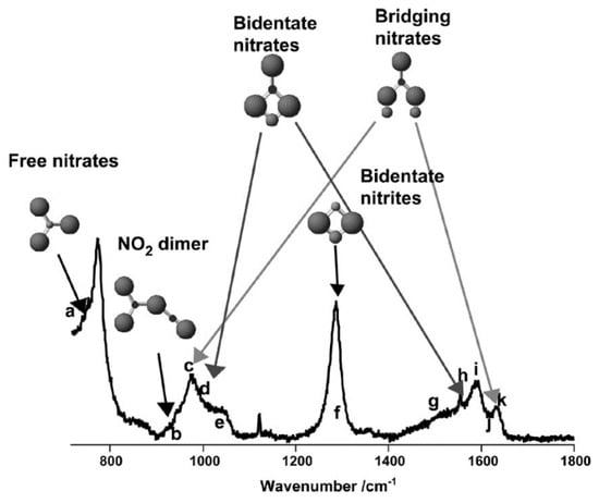 In situ Raman spectrum of SnO2 in 1000 ppm NO2 atmosphere at 25 °C. The assignment of the peaks is as follows: a,e—free NO3; b—NO2 dimer; c, j, k—bridging nitrates; d, g, h, i—bidentate nitrates; f—bidentate nitrites. Reproduced with permission from [31].