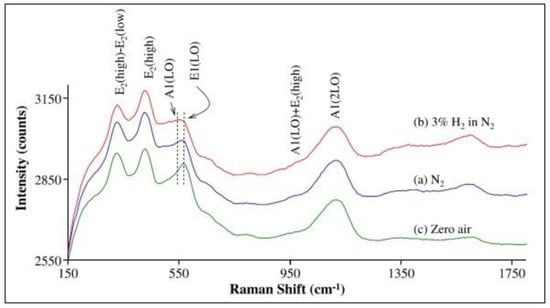 In situ Raman spectra of ZnO (sample A) in (a) N2, (b) 3% H2 in N2, and (c) zero air. The spectra are offset or clarity. Modified from [30].