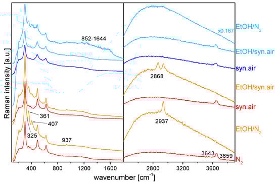 In2O3 gas sensors. In the first example of the application of operando Raman spectroscopy, we will discuss the EtOH detection by indium oxide gas sensors [5]. In this study, a simultaneous measurement of the resistance, Raman spectra and gas-phase IR spectra during sensor operation was performed, but here we will focus on the discussion of the Raman spectra. Figure 7 depicts operando Raman spectra (514.5 nm) of the In2O3 gas sensor recorded in different gas environments at 190 °C (red/orange) and 325 °C (blue). Starting at 190 °C in nitrogen, the phonon region is characterized by oxide bands at 304, 361, 493, and 624 cm−1, confirming the presence of bixbyite-type c-In2O3, [5,38]. Whereas, the high-frequency region shows the presence of (bridging) hydroxy bands at 3643 and 3659 cm−1.