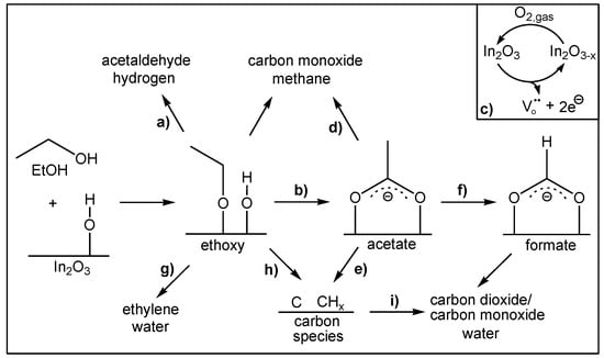 On the basis of a large number of experiments, which are detailed in [5,34], a reaction mechanism of EtOH gas sensing on In2O3 gas sensors was proposed (see Figure 8). In the following, we will summarize its main features. Adsorption of ethanol on the indium oxide surface leads to ethoxy formation, which can either desorb as acetaldehyde; (a) or react with surface hydroxyl groups to form acetate (b). In the course of the redox reaction indium oxide near the surface is reduced (c), releasing electrons in the conduction band thus inducing a decrease in the sensor resistance. A second contribution to the conductivity for ethanol gas sensing is the high stability of the adsorbed acetate. Only thermal decomposition of acetate (d,e) enables the sensor to start returning to its initial surface state, while in the presence of oxygen, acetate partly decomposes to formate-like species (f).