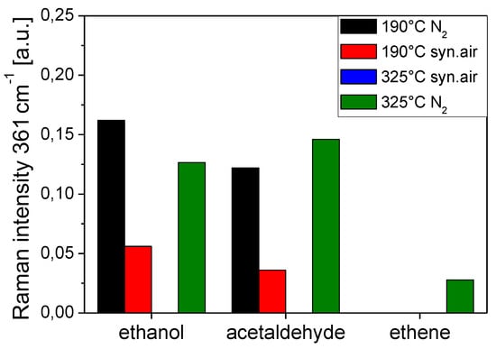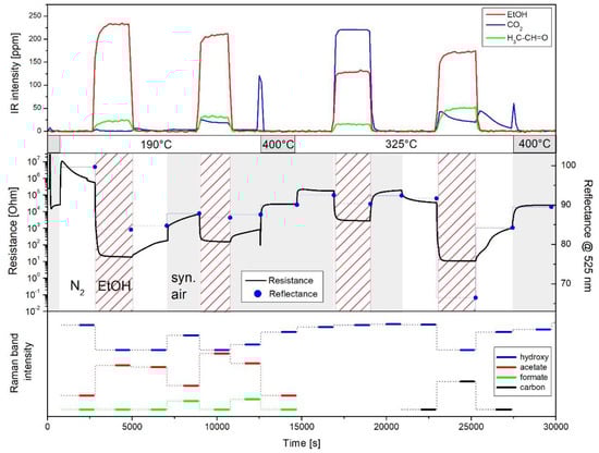 In the following, the correlation of the sensor resistance with the spectroscopic features will be briefly described, focusing on the Raman results. For details please refer to [6]. Exposing the gas sensor to a reducing gas, i.e., 250 ppm EtOH/N2 at 190 °C results in the expected decrease in resistance due to the release of electrons into the conduction band, while carbon dioxide, acetaldehyde, and water (not shown) are detected as reaction products. As discussed in Section 4.1, the formation of acetaldehyde has previously been proposed to proceed via adsorbed ethoxy undergoing dehydrogenation. Besides, the presence of EtOH/N2 leads to a strong reflectance decrease from 100% to 84% as a result of oxygen-vacancy formation, i.e., the reduction of SnO2 [47]. Whereas, Raman data reveals the presence of acetate species as a result of the reaction between (adsorbed) ethanol and surface hydroxy groups. When the feed is switched back to pure nitrogen, a small increase in the resistance and decrease in the acetate Raman band is observed. As discussed previously, this behavior originates from the formation of stable acetate adsorbates formed during EtOH/N2 exposure, preventing the sensor from returning to its initial state [5,34]. The addition of oxygen to the feed induces a resistance increase as a result of reoxidation of the surface, removing electrons from the conduction band. This is reflected by Raman spectra exhibiting a decrease in the acetate and an increase in the formate signal, thus, indicating the partial decomposition of acetate into formate, and by UV-Vis spectra showing an increase of the reflectance (to 88%). When switching to 250 ppm EtOH/air, the observed resistance and reflectance (to 87%) decrease is less pronounced than in EtOH/N2 due to permanent reoxidation by oxygen. The presence of oxygen results in a larger conversion of EtOH and the formation of larger amounts of carbon dioxide. Adsorbed species acetates are detected in the Raman spectra as in case of EtOH/N2 exposure.