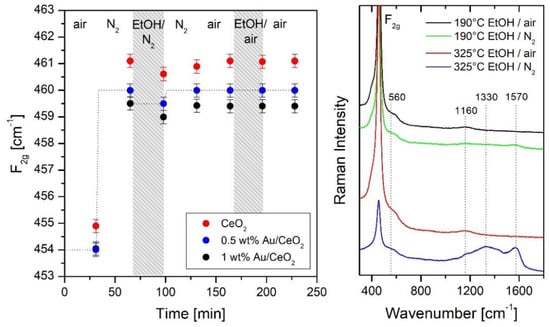 The left of Figure 10 depicts a comparison of the F2g band positions for CeO2, 0.5 wt.% Au/CeO2, and 1 wt.% Au/CeO2 gas sensors during ethanol gas sensing at 190 °C (250 ppm EtOH/N2, for details see [34]). Previously, it has been shown based on theoretical studies [36], that there is a linear relationship between the redshift of the F2g band position and the changes δ in ceria stoichiometry CeO2-x-δ due to increasing oxygen-vacancy concentration. Thus, the position of the F2g mode can serve as a quantitative indicator for changes in the oxygen-vacancy concentration, with a redshift of 1 cm−1 corresponding to a change in stoichiometry of δ = 0.024. According to Figure 10, Au-loaded samples show a stronger redshift in the initial F2g band position at 400 °C, compared to bare ceria, corresponding to a higher oxygen-vacancy concentration, which is consistent with the prediction from theory and previous experimental studies [42,43]. Upon cooling to 190 °C the F2g band experiences a pronounced blueshift as a result of lattice contraction [36].