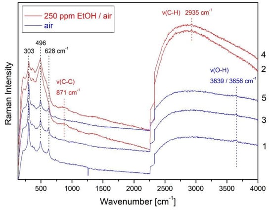 Operando surface-enhanced Raman spectroscopy (SERS) during EtOH sensing at 190 °C using In2O3 doped with Ag. Raman spectra were recorded at 514.5 nm excitation when switching between air (blue) and EtOH/air (red). Spectra are offset for clarity. Modified from [35].