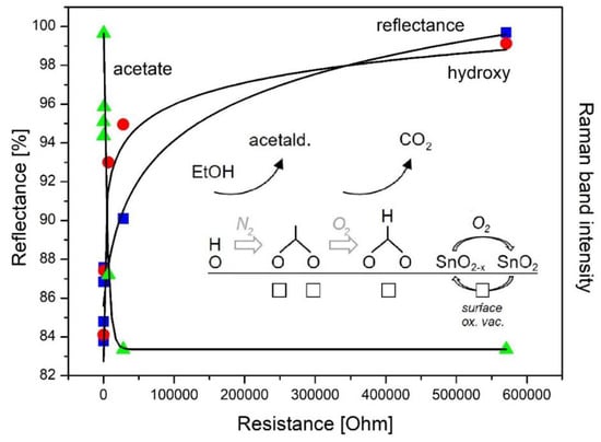 Proposed mechanism of the ethanol gas sensing of SnO2. Reflectance and Raman band intensities of hydroxy and acetate species as a function of sensor resistance, together with least-squares fits to the experimental data. Reproduced from [6].