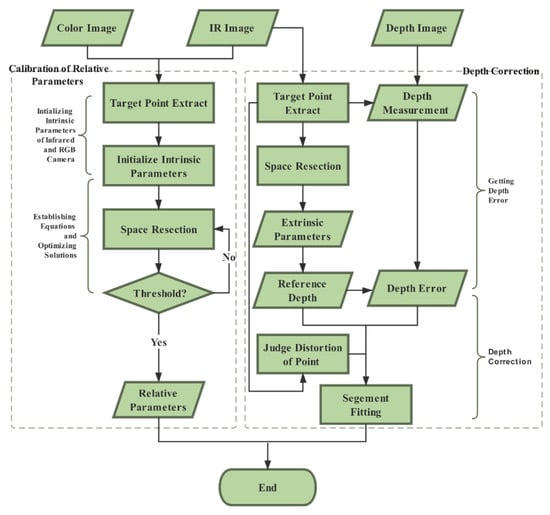 In this section, we explain our proposed calibration scheme in detail. We established a geometric imaging model of RGB-D camera based on a collinear equation, and then calibrated the depth measurement according to the rigorous imaging model of a depth camera. For the relative pose between a depth camera and an RGB camera, we built the calibration model based on space resection and collinear equation in the field of photogrammetry, and optimized the solution of relative pose by least-squares iteration. Both aspects constituted our calibration scheme in this paper. The flowchart of our proposed method is shown in Figure 2. We present our method and process systematically in Section 2.1 and Section 2.2, respectively.