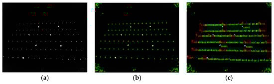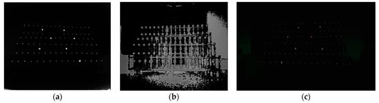 Figure 9. Image captured in 3D control field (a); (b) reflective targets of infrared image were identified; (c) reflective targets of infrared image were registered. - (2)