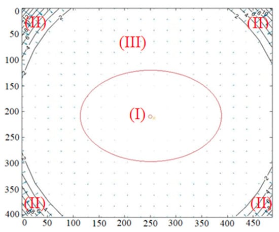 According to the overall distortion effect of the infrared camera shown in Figure 5, we divided the distortion of pixels in the image into two parts: obvious distortion and slight distortion. It was more suitable to correct the depth error based on the different distorted regions in the depth image. The pixels in the red ellipse had a slight distortion, whereas others had an obvious distortion. According to the previous assessment of depths and analysis of distorted pixels in the depth camera [31,55], we knew that the farther away a pixel was from the principal point of an image, the more obvious its distortion was. Combining with the overall distorted fact of pixels in an infrared camera, we briefly divided the ranges of pixels into three regions (shown in Figure 5): the region of the red ellipse (I), the region of four corners (II), and a region consisting of the rest, except for the central region and the four corners (III). As there was slight distortion in region (I), we assumed that the pixels in region (I) were affected by the distortion negligibly in the depth measurement. In addition, the number of pixels with valid depth measurements in region (II) was smaller, and the distortion of pixels in both regions (II) and (III) were more obvious. Thus, we merged region (II) and region (III), and we considered that the pixels with depth measurements in the two regions were affected by the distortion significantly. The interval ranges of the red ellipse were approximately x (165, 334) and y (141,279), respectively.