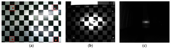Image of checkerboard and infrared image: (a) checkerboard; (b) infrared image captured at a distance of 0.5 m; (c) infrared image captured at a distance of 4.5 m.