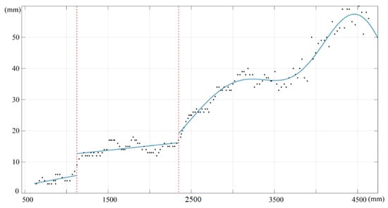 After getting the reference depths of corners in infrared images, we could acquire the depth measurements from the corresponding depth images. The correction results of the depth measurements are shown in Figure 7. We considered the altitude of depth error as the vertical axis and the depth value as the horizontal axis to solve the fitting function. To ensure the effect of error fitting, the depths were divided into three intervals: 0.5–1.2 m, 1.2–2.3 m, and depths that were greater than 2.3 m. In order to ensure that the root mean square standard error of the fitting result was minimal in each interval, both linear and Gaussian function models were used to fit the depth error, respectively. Reviewing the fitting results, all of the root mean square standard errors (RMSE) of the fitting function were less than 2.25 mm.